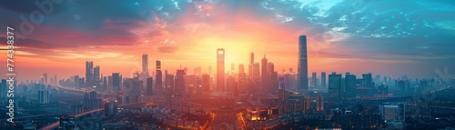 Futuristic cityscape with interconnected transport systems and highspeed trains