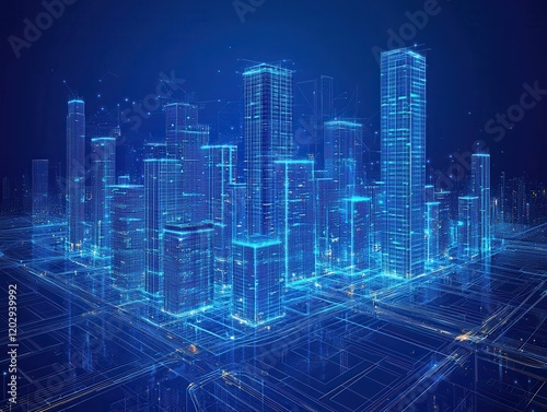 Futuristic Cityscape with Neon Blue Lights and Digital Overlay Representing Smart Technology and Urban Innovation in a Modern Metropolis Environment