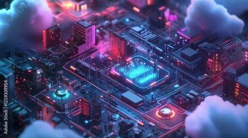 Futuristic Cityscape with Neon Lights and Abstract Technology Elements