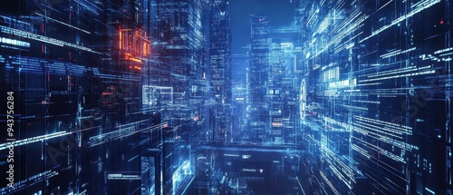 Futuristic Cityscape with Neon Lights and Digital Code - Abstract Technology Background.