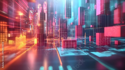 Futuristic Cityscape with Neon Lights and Digital Grid