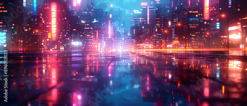 Futuristic Cityscape with Neon Lights Reflecting on Wet Pavement