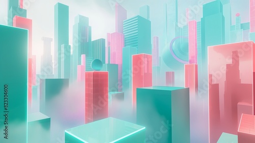 Futuristic cityscape with neon pink and teal skyscrapers covered in fog, creating a surreal, dreamlike urban environment.