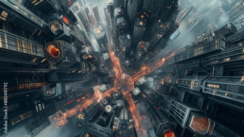 Futuristic cityscape with vertical architecture and glowing traffic lines.
