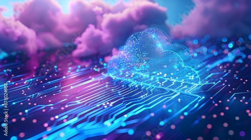 Futuristic cloud computing concept, digital data flow, and technology with purple clouds and glowing circuits. 3D visualization.