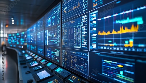Futuristic command center monitoring worldwide operations, multiple large screens showing realtime data, hightech equipment, digital displays, modern control room setup