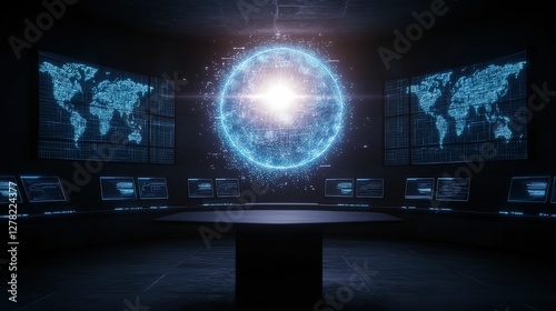 Futuristic command center operations digital sphere visual technology high-tech environment central perspective innovation strategy