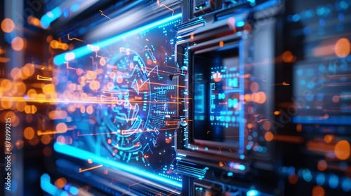 Futuristic computer circuit board with vibrant lights, representing advanced technology and digital innovation.