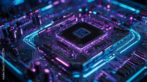 Futuristic Computer Microchip with Neon Purple and Blue Lighting on Circuit Board