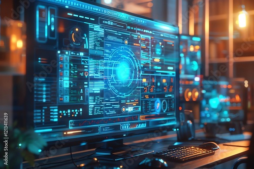 Futuristic computer screen displaying data analysis.