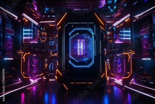 Futuristic computer technology with a laptop in neon colors. For cover backgrounds, wallpapers and other modern projects. Generative AI