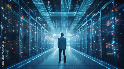 Futuristic Concept Data Centre. Technology Officer Standing In Warehouse, Information Digitalization Lines Streaming Through Servers. SAAS, Cloud Computing, Web Service