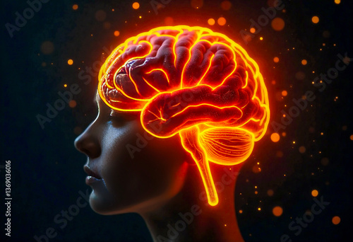 Futuristic concept of artificial intelligence and neuroscience — glowing neon brain inside a human silhouette. Vibrant digital visualization representing innovation, machine learning, and human mind t