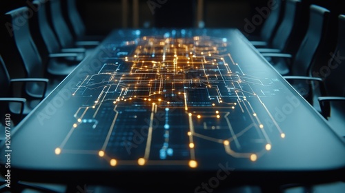 Futuristic Conference Room with Digital Circuit Board Design on Table Surface Illuminated by Warm Lighting, Creating a Technology-Inspired Workspace