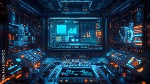 Futuristic control panel displaying holographic production data in a factory, surrounded by metallic robots, glowing digital graphs, vibrant blue lighting, cybernetic, hyper-detailed 3D