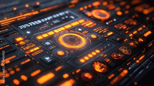 Futuristic control panel interface; orange lights; dark background; technology concept