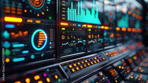 Futuristic control panel with glowing blue and orange indicators, displaying charts and graphs.