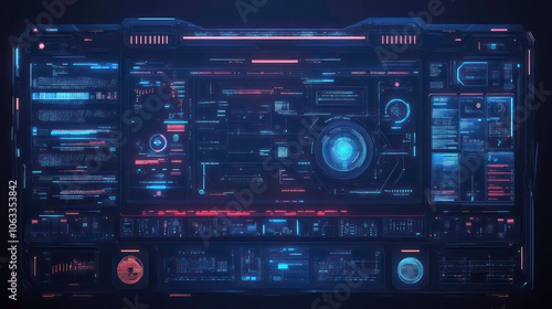 Futuristic control panel with intricate digital displays and glowing elements.