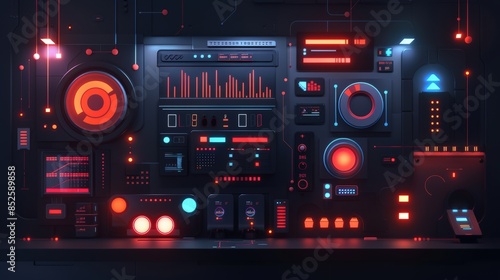 Futuristic control panel with various buttons, dials, and glowing displays, ideal for technology, sci-fi, or video game design themes.