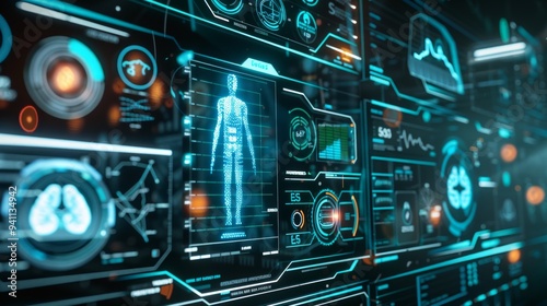 Futuristic control panel with virtual buttons for managing healthcare analytics and patient data in modern medical environments