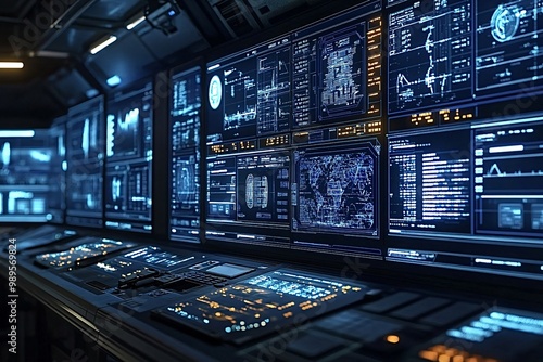 Futuristic control room in a spacecraft showing multiple screens with charts, data and a world map, suggesting advanced space exploration and navigation technologies