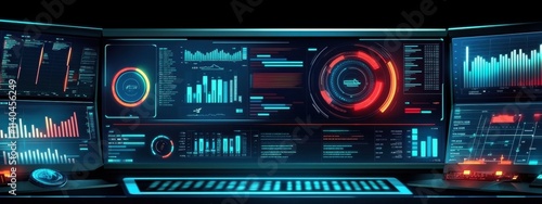 Futuristic Control Room with Advanced Technology Displaying Data Analytics, User Interface Designs, and Graphical Representations of Information in Cyber Environment