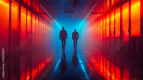Futuristic Corporate Professionals Walking in Neon-Lit Data Center. Generative ai