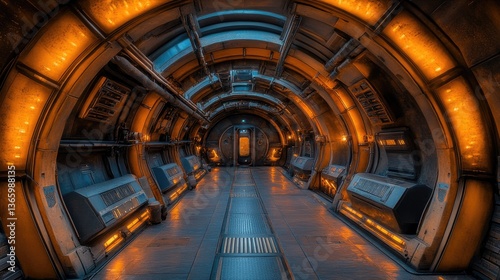 Futuristic corridor, glowing lights, empty hallway, background, interior, travel, exploration, entertainment