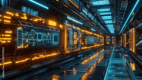 Futuristic corridor with glowing blue and orange lights, showcasing advanced technology and design