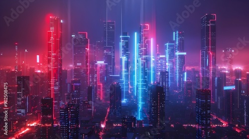 Futuristic Cyber City Skyline with Glowing Neon Lights and Holographic Displays
