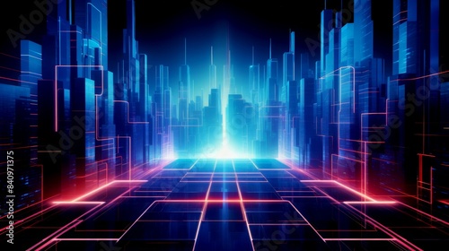 Futuristic cyber cityscape with bright neon lights, depicting a digital city grid with skyscrapers and glowing pathways.