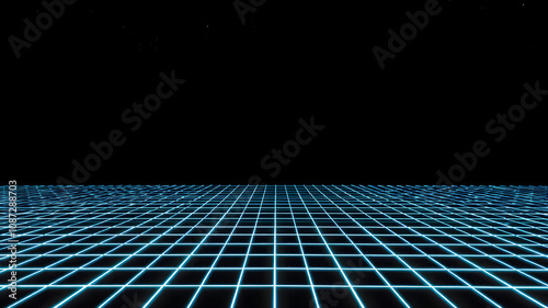 Futuristic cyber horizon 8K background image where the ground is a grid of bright white and blue lines, extending horizontally to the horizon