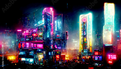 Futuristic cyberpunk city full of neon lights at night, Retro future illustration in a style of pixel art, Blurred background