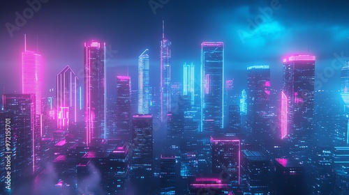 Futuristic cyberpunk city skyline with neon lights in pink and blue.