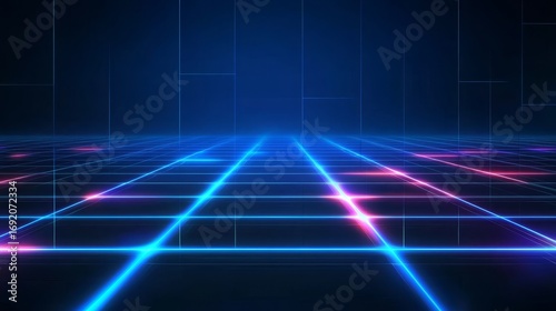 Futuristic Cyberpunk Urban Landscape with Glowing Neon Lights and Advanced Technology Grid Design