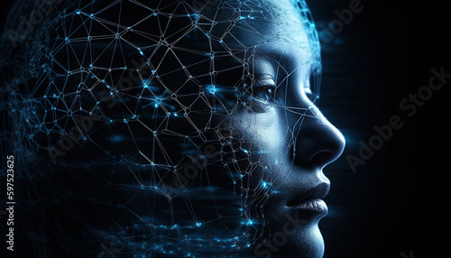 Futuristic cyborg illuminated in blue, digitally generated image generated by AI