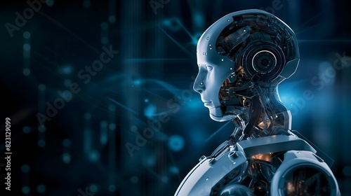 Futuristic cyborg with a humanoid face and glowing blue lights, set against a blurred cityscape
