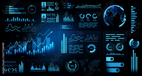 Futuristic dashboard interface with data analytics elements and global business infographics in glowing blue tones on dark background. Concept visualization. 3D Rendering