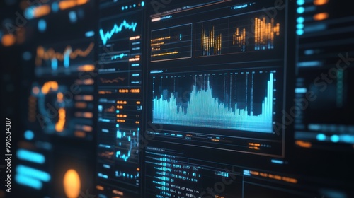Futuristic data analytics dashboard showcasing vibrant blue and orange visualizations.