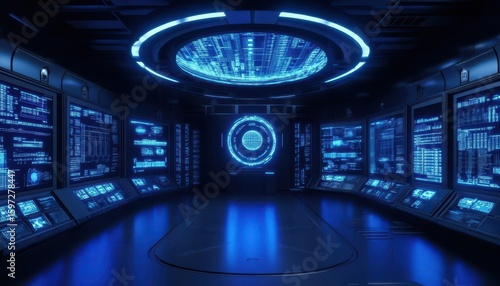 Futuristic Data Center Control Room with Blue Digital Interfaces and Holographic Globe for