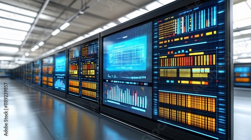 Futuristic Data Center Server Room with Bright Screens Displaying Digital Information and Graphs