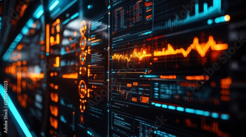 Futuristic Data Center Server Room with Digital Displays Showing Stock Market Data and Graphs