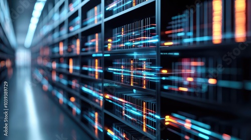 Futuristic data center shelves filled with glowing servers and digital storage.