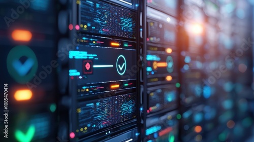 Futuristic Data Center with Advanced Servers and Colorful Digital Interfaces Designed for High-Tech Business and Cloud Computing Solutions