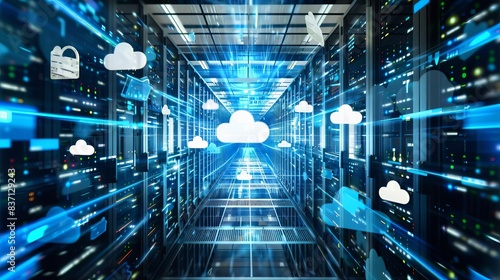 Futuristic data center with cloud computing icons and secure servers. Digital infrastructure and technology concept.
