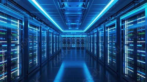 Futuristic Data Center with Glowing Blue Server Racks and Intricate Cable Network