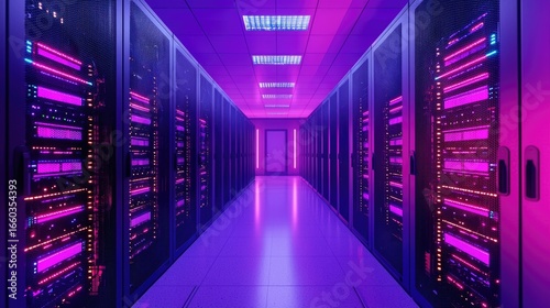 Futuristic data center with glowing neon purple lights illuminating server racks, representing advanced technology, cloud computing, and modern digital infrastructure