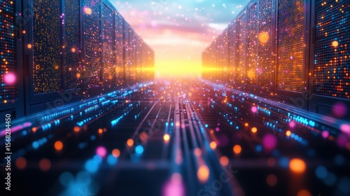 Futuristic data center with glowing servers and digital networking environment at sunset