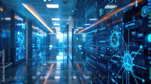 Futuristic data center with holographic displays and neon lights
