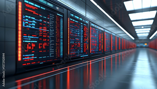 Futuristic Data Center with Rows of Servers Featuring Red and Blue Lights in a Dimly Lit Room Reflecting on the Wet Floor